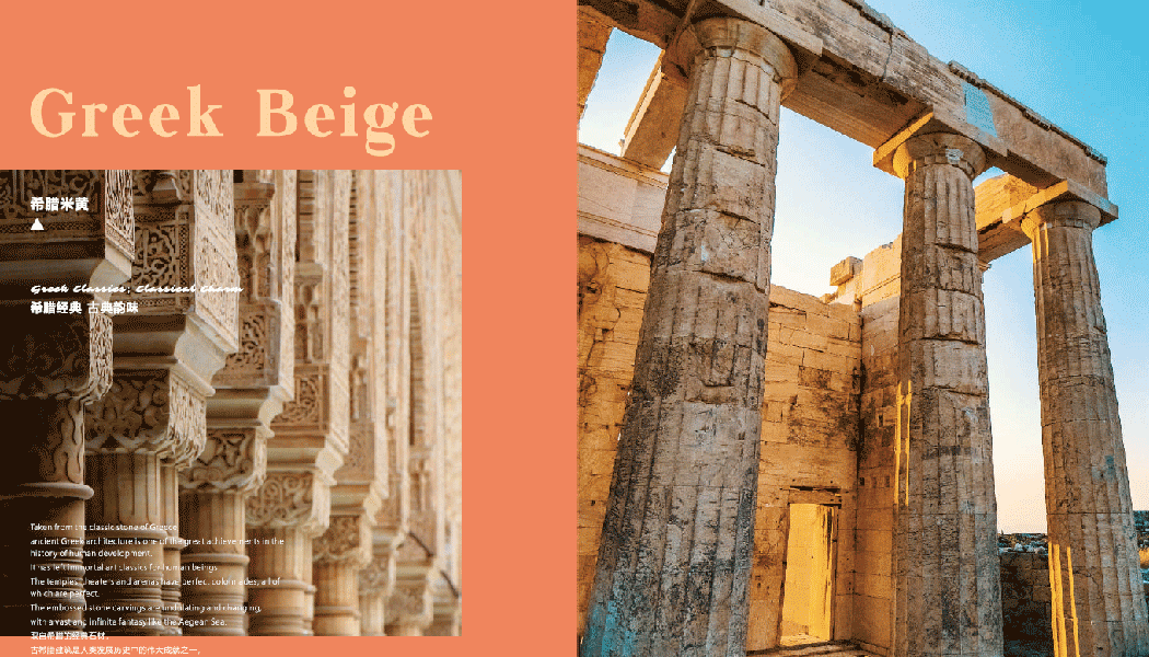 取自希臘的經典石材, 古希臘建筑是人類發展歷史中的偉大成就之一, 給人類留下了不朽的藝術經典之作, 神廟、劇場、競技場都有完美的柱廊, 都有完美的浮雕石刻,起伏變化著, 有著像愛琴海一般廣闊無邊的幻想。