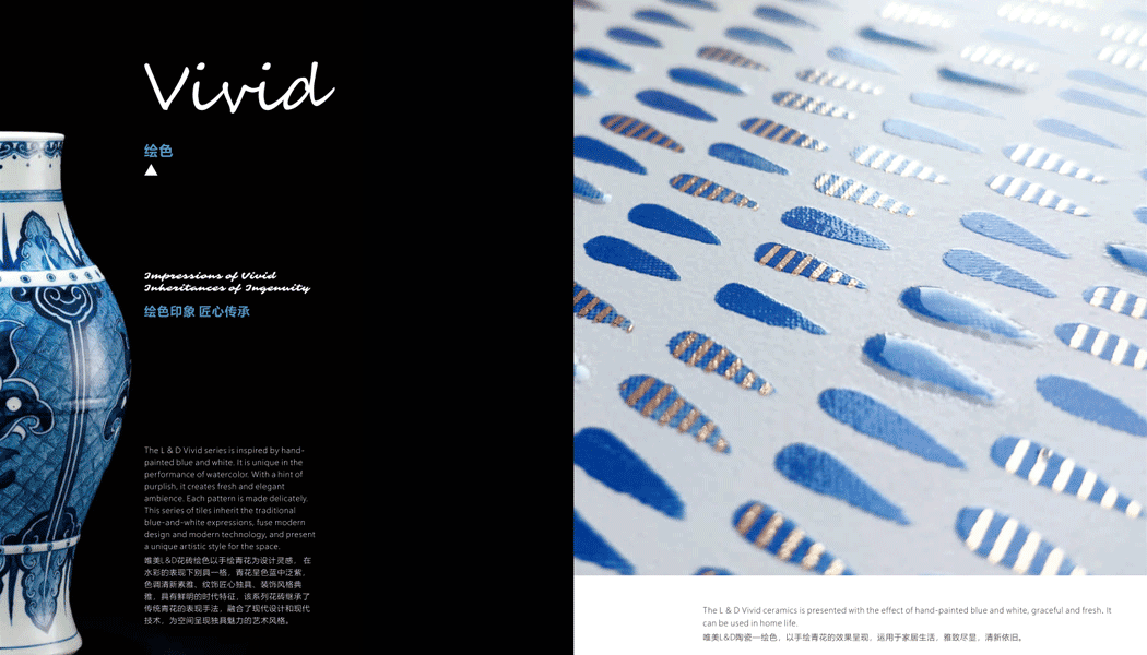 唯美L&D花磚繪色以手繪青花為設(shè)計(jì)靈感, 在水彩的表現(xiàn)下別具一格,青花呈色藍(lán)中泛紫,色調(diào)清新素雅、紋飾匠心獨(dú)具、裝飾風(fēng)格典雅,具有鮮明的時(shí)代特征,該系列花磚繼承了傳統(tǒng)青花的表現(xiàn)手法,融合了現(xiàn)代設(shè)計(jì)和現(xiàn)代技術(shù),為空間呈現(xiàn)獨(dú)具魅力的藝術(shù)風(fēng)格。